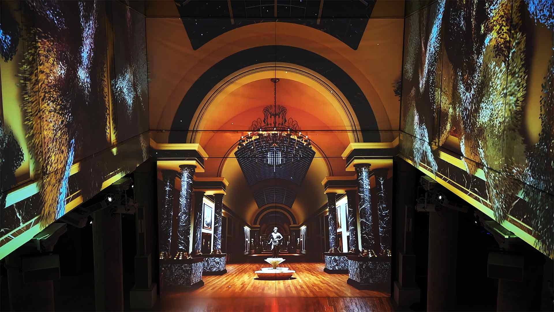 - Inmersiva Experience: In collaboration with Palacio Neptuno in Madrid, we created an immersive experience where digital design and 360° projections completely enveloped attendees. Using Unreal Engine 5 and Notch VFX, we generated visual scenarios like journeys through the cosmos, with moving stars and nebulae, or a digital art gallery where artworks came to life through light and movement. Completing the experience was a table mapping, displaying synchronized visual content on tables that complemented the event’s narrative.