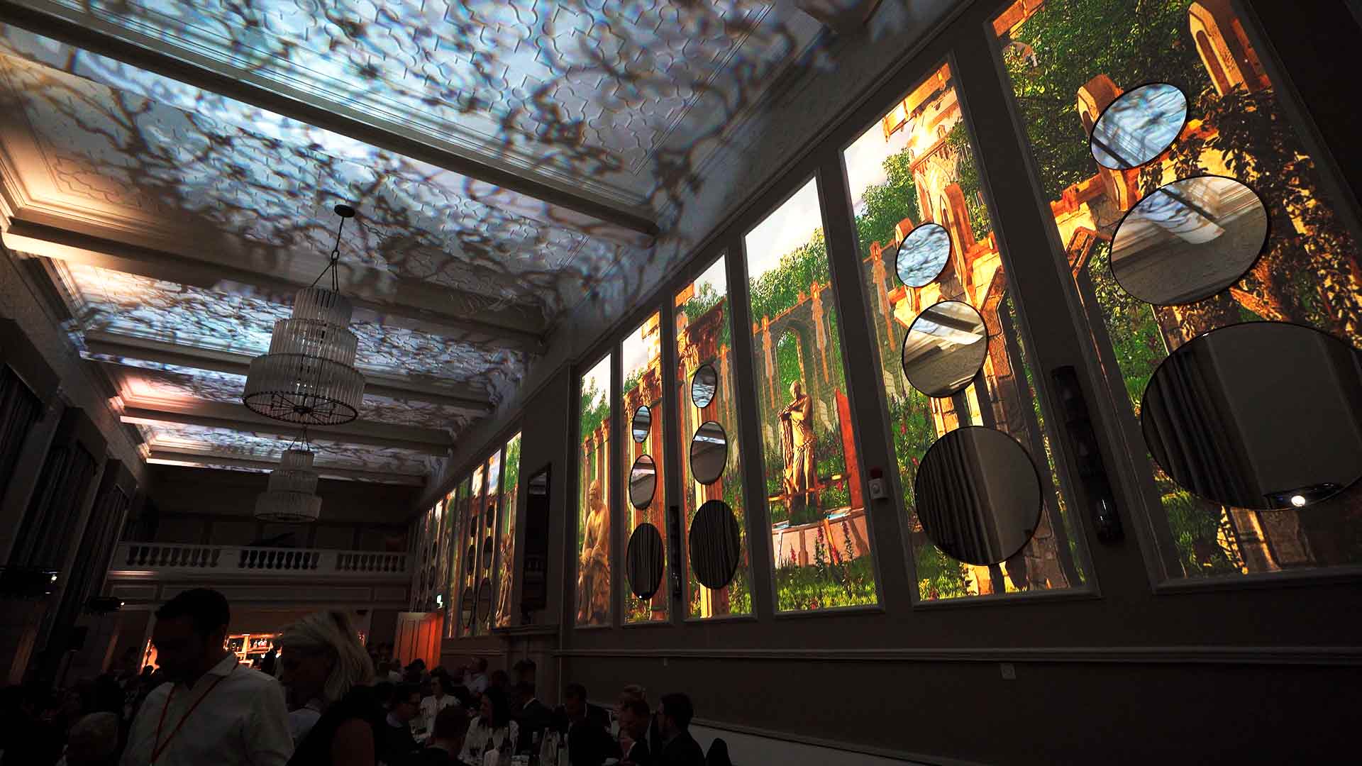 - GORE UK: We transformed this corporate event into an immersive journey that transported attendees to Ancient Greece through three key moments. The experience began with video mapping on the exterior facade, narrating the evolution of Gore’s medical technology through immersive images and mythological references. This audiovisual projection marked the evening’s opening and prepared guests for a unique dining experience. Inside, guests enjoyed an immersive banquet environment with projections recreating temples, gardens, and scenes inspired by Greek aesthetics, fully immersing them in a magical evening. To conclude, an interactive AI-powered photo booth transformed their photos into portraits of Greek gods and heroes, offering a unique souvenir that enhanced the experience.
