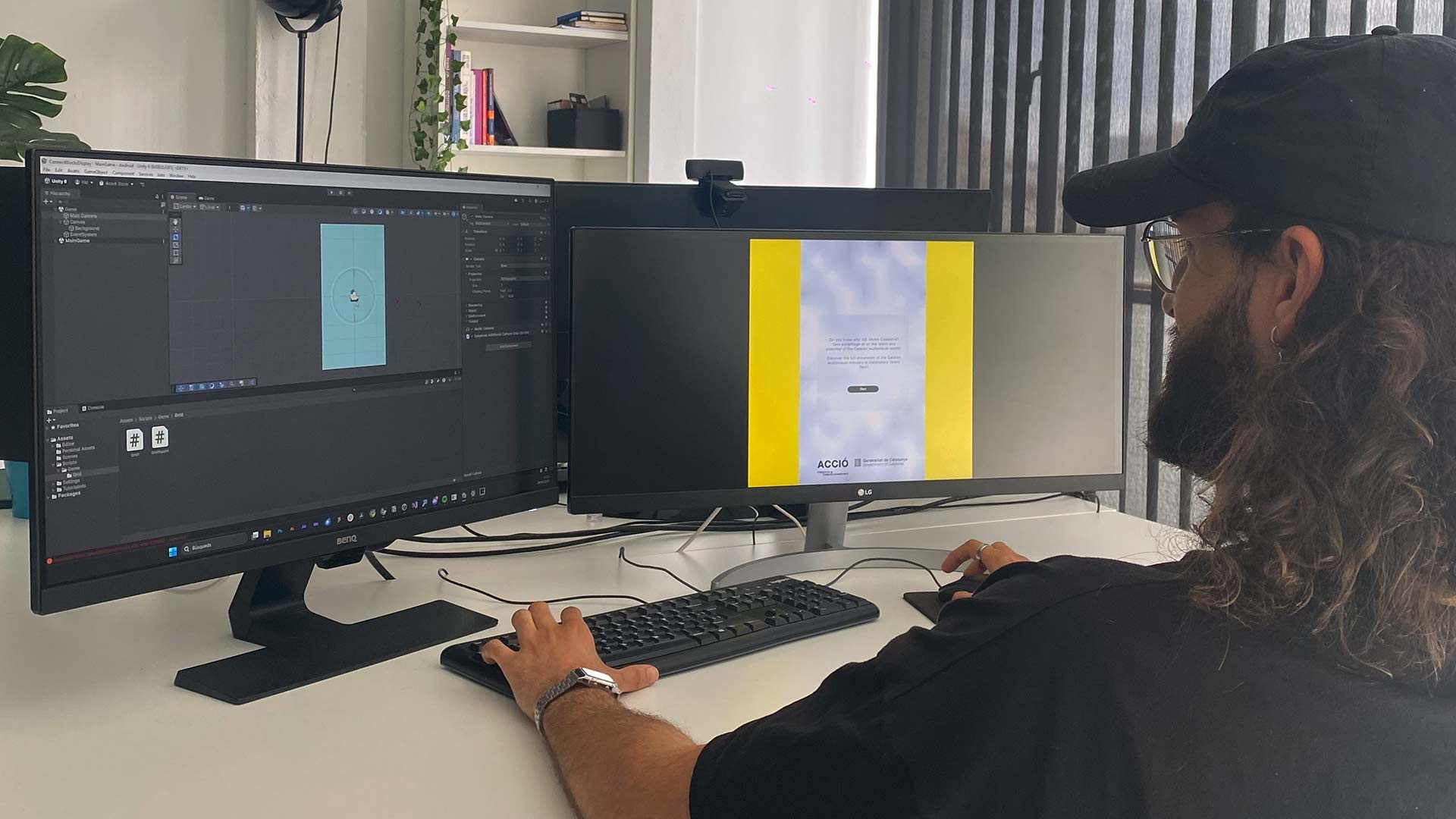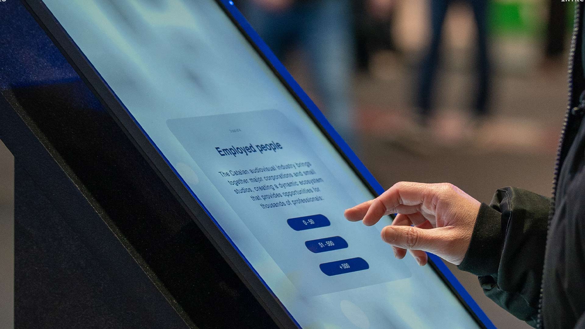 This installation we did for ISE 2025, transformed data from the Catalan audiovisual ecosystem into generative visuals in real time. The interaction point was a tactile totem from which visitors answered questions about the sector. Their answers activated an algorithm developed in Unity that modified in real time the display shown on a curved LED screen.