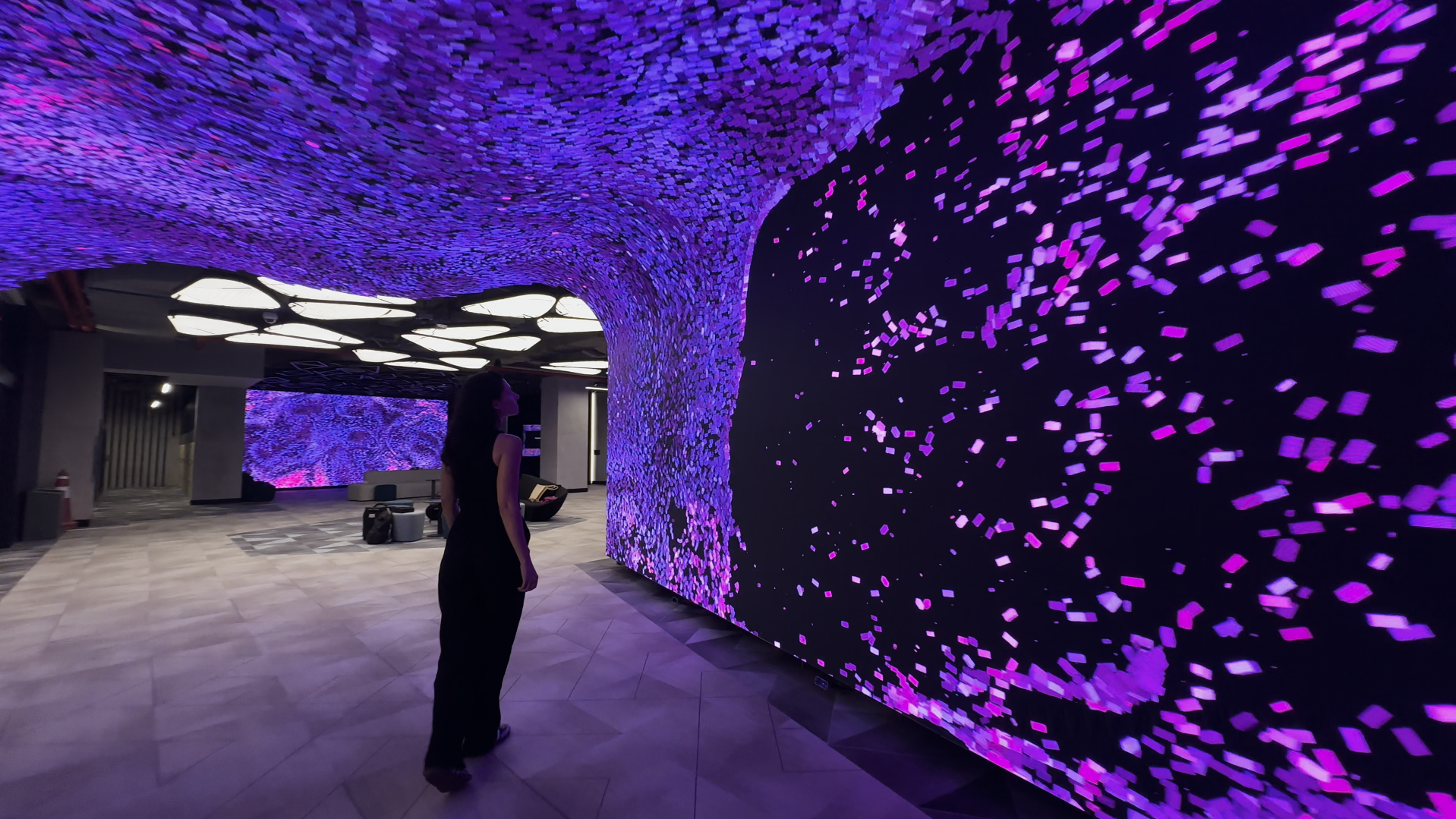 This project allowed us to develop an enveloping space where interactive sensor technology transforms environmental perception. We created an immersive corridor for offices in NEOM with curved LED screens responding to visitors’ movements. Using Kinect cameras, we captured silhouettes and gestures, generating particle graphics in Notch VFX evolving in real-time. Some screens displayed dynamic images reacting to movement, while others remained static to balance the visual atmosphere.